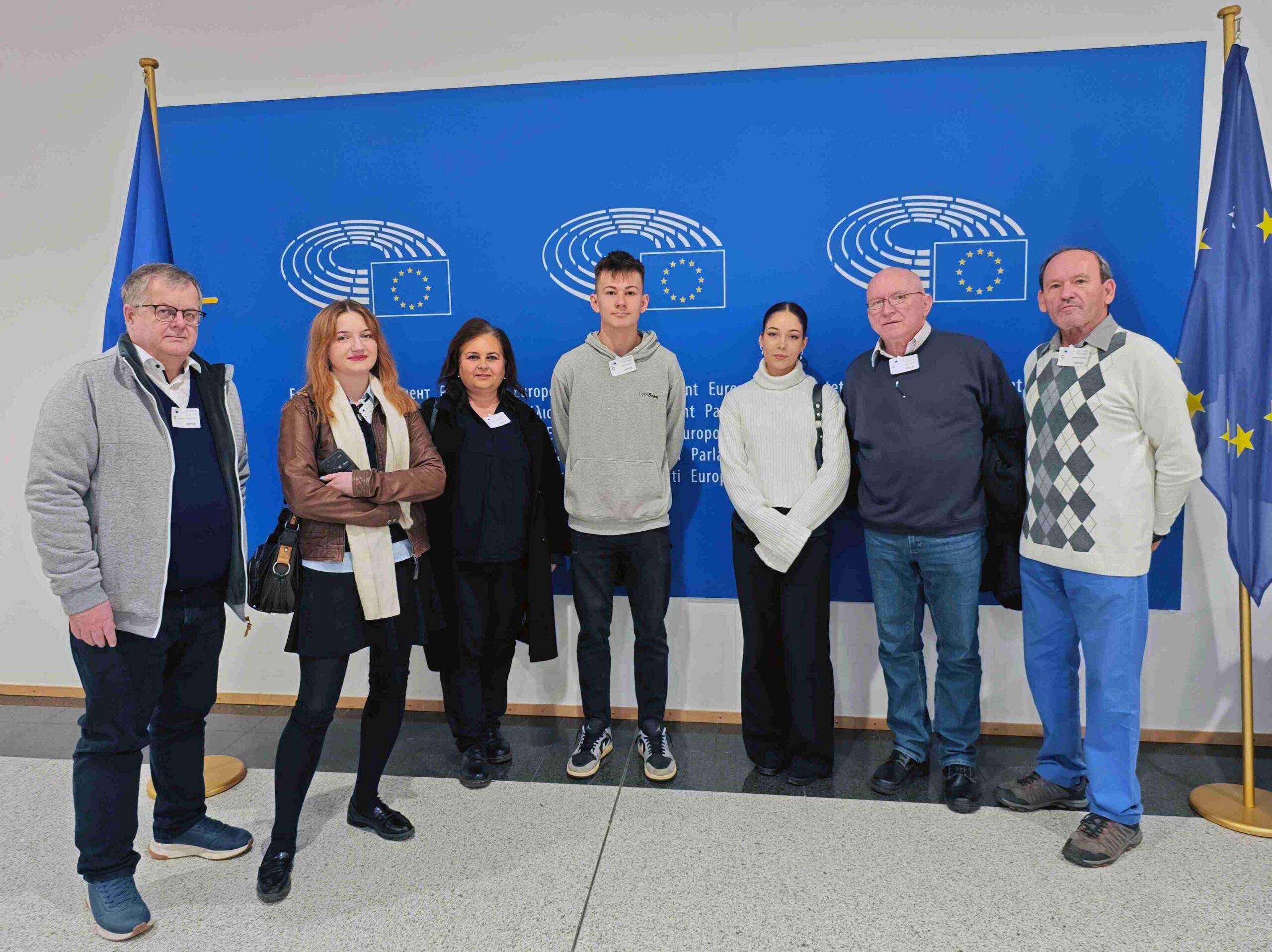 Spoločná fotografia účastníkov zájazdu – víťazov Celoslovenskej súťaže esejí Jána Horárika študentov stredných škôl do Európskeho parlamentu pri symboloch Európskeho parlamentu a Európskej únie. Zľava: Roman Hradecký (Spoločnosť Promethus), Lucia Tomová (študnetka), Dana Schneiderová (učiteľka), Martin Bajzík (študent), Karin Müllerová (študentka), Jozef Sičák a Jozef Fabian (obaja Spoločnosť Prometheus). Fotografia: Spoločnosť Prometheus